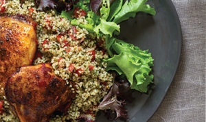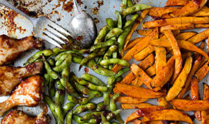 Dinner in a snap: chicken, edamame in the pod, and sweet-potato fries.